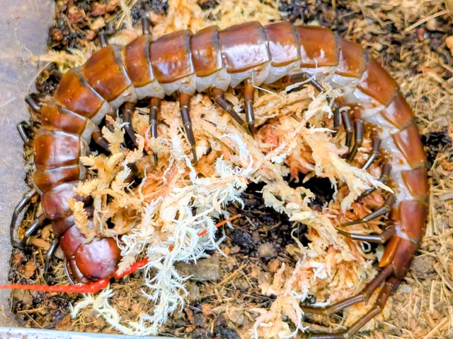 Scolopendra sp. ベトナム原産の大型ムカデで、通称「ホワイトビアード」と呼ばれる巨大種と同種とされる迫力ある個体群。 夕焼けのような明るみのある赤を感じさせる体色と、重量感のある体つきが特徴で、Scolopendra 属の中でも存在感は抜群です。動きは俊敏で捕食シーンの観察も魅力のひとつです。 【特徴】 ・ホワイトビアードと同種とされる大型 Scolopendra ・重厚感のある体型とベルベット調の体色 ・非常に迫力のあるサイズに成長 ・観賞価値の高い上級者向けムカデ 【飼育環境の目安】 ・ケージ:脱走防止を徹底した密閉性の高いケース ・床材:ヤシガラ土、腐葉土を厚めに敷く ・温度:24〜28℃ ・湿度:70〜80%(蒸れに注意) ・隠れ家:流木、コルク、石など複数設置 【注意事項】 ・非常に攻撃性が高く、毒性も強いため上級者向けです。 ・素手での接触やハンドリングは絶対に行わないでください。 ・脱走事故防止のため、フタ・通気部の管理を徹底してください。 ・撮影個体、または同等クオリティの個体をお届けします。 ・生体の状態により、発送日の調整をお願いする場合があります。
