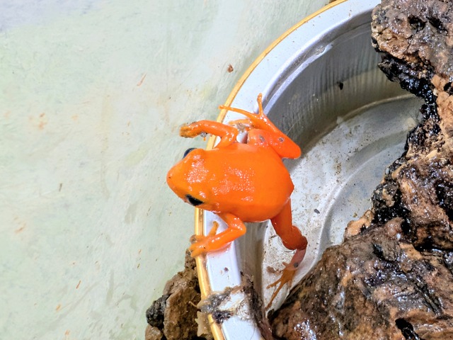 Mantella auranliaca マダガスカル固有の小型美麗ヤドクガエルで、鮮やかなオレンジ色の体色が最大の特徴。 強い警戒色を思わせる発色と、小型ながら存在感のある姿から非常に人気の高い種です。 昼行性で活動的な一面もあり、テラリウム内での観察性にも優れています。 【特徴】 ・鮮烈なオレンジ色が映える美麗種 ・成体サイズ:約2.5–4cm ・マダガスカル固有種 ・昼行性で比較的よく動く ・小型ながら観賞価値が高い 【飼育環境の目安】 ・ケージ:通気性を確保した湿潤系レイアウト ・床材:ヤシガラ土、腐葉土、ミズゴケなど ・温度:22–26℃ ・湿度:70–90% ・レイアウト:落ち葉、流木、シェルターを多めに配置 ・水場:浅めのウォーターディッシュを設置 【注意事項】 ・高温に弱いため、夏場の温度管理には特に注意してください。 ・過度なハンドリングは避け、観賞中心での飼育を推奨します。 ・撮影個体または同等クオリティの個体をお届けします。 ・生体の状態により、発送日の調整をお願いする場合があります。