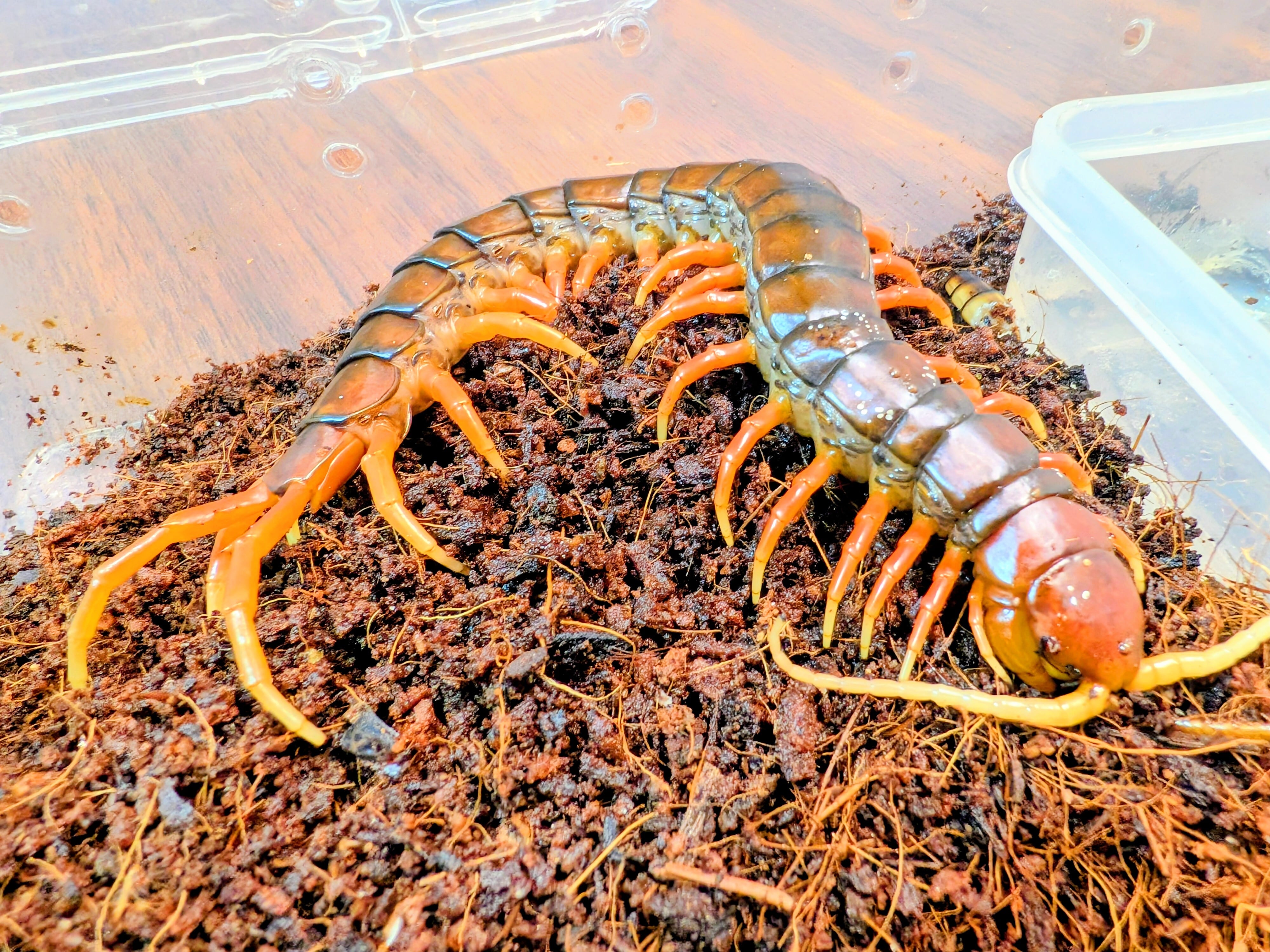 夕焼けのような明るみのある赤を感じさせる体色と、重量感のある体つきが特徴で、Scolopendra 属の中でも存在感は抜群です。動きは俊敏で捕食シーンの観察も魅力のひとつです。