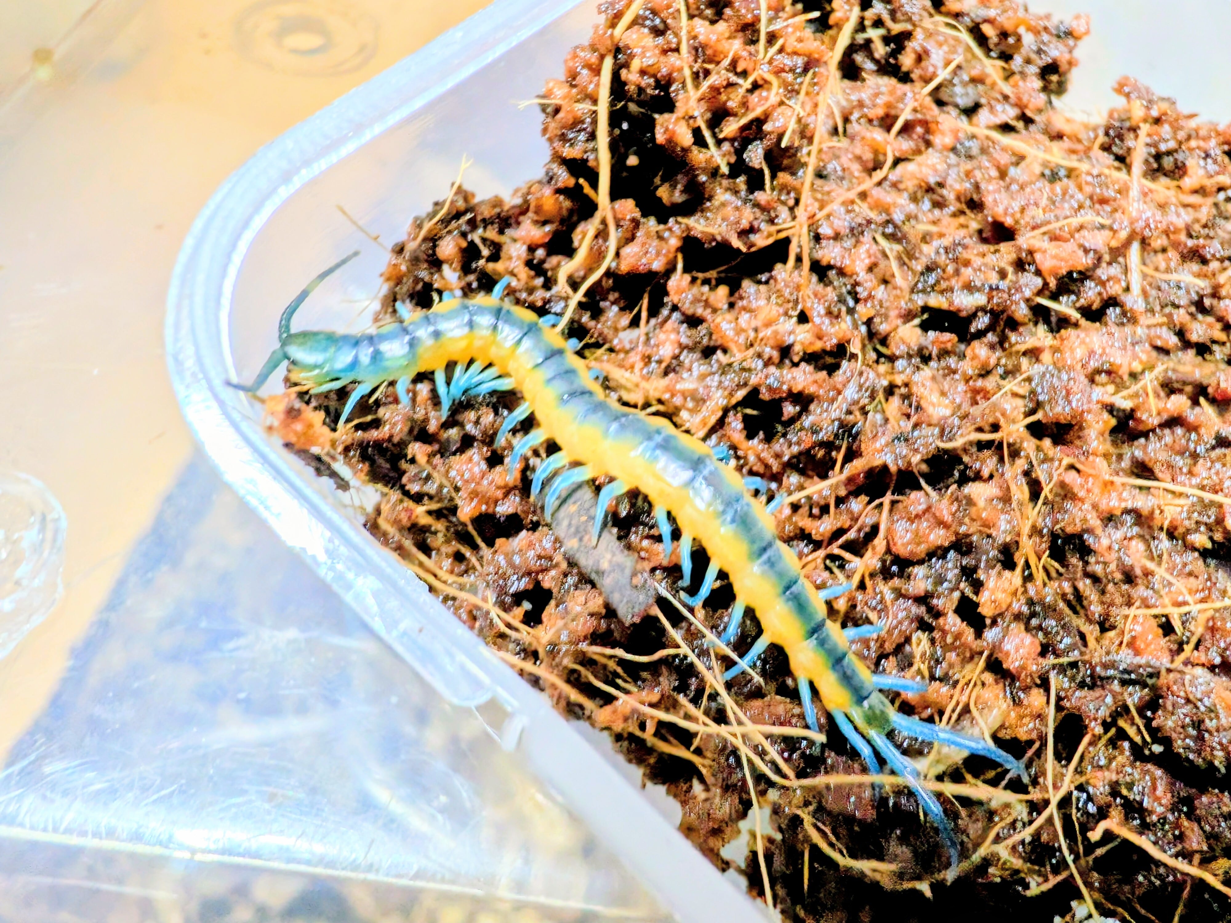 ダークボディに鮮やかなブルー〜ブルーグリーンの発色が乗る美麗タイプで、光の当たり方によってメタリック調に見えることもあります。Scolopendra 属らしい力強さとスピードを兼ね備えた魅力的な大型ムカデです。