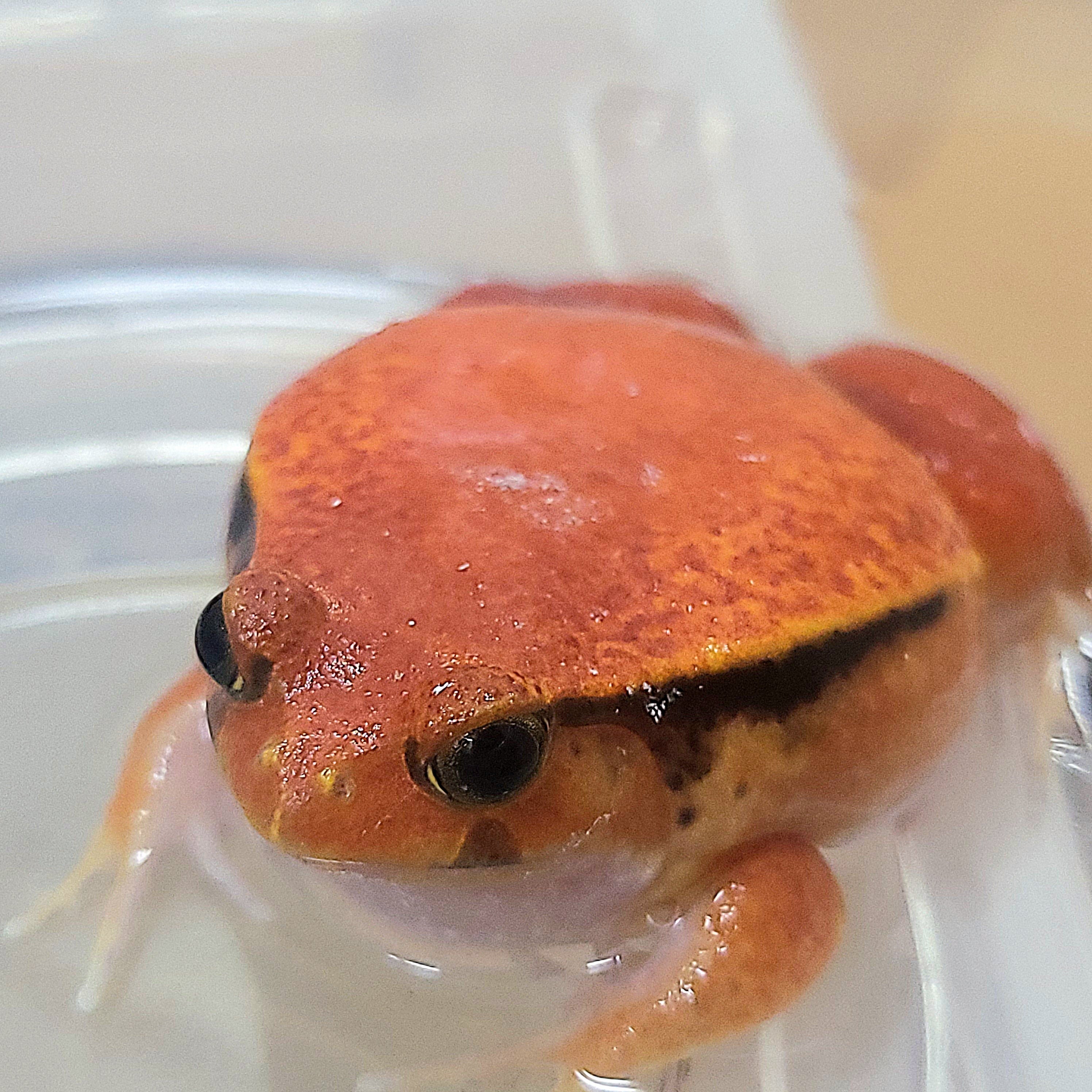 名前の通り、熟したトマトのような赤〜オレンジ色の体色が特徴で、ずんぐりとした丸みのある体型が愛嬌のある人気種です。近縁種のトマトガエルと比べると、やや落ち着いたサビ色〜オレンジ系の発色を見せることから「サビトマトガエル」と呼ばれています。丈夫で環境にも順応しやすく、観察しやすい種類です。
